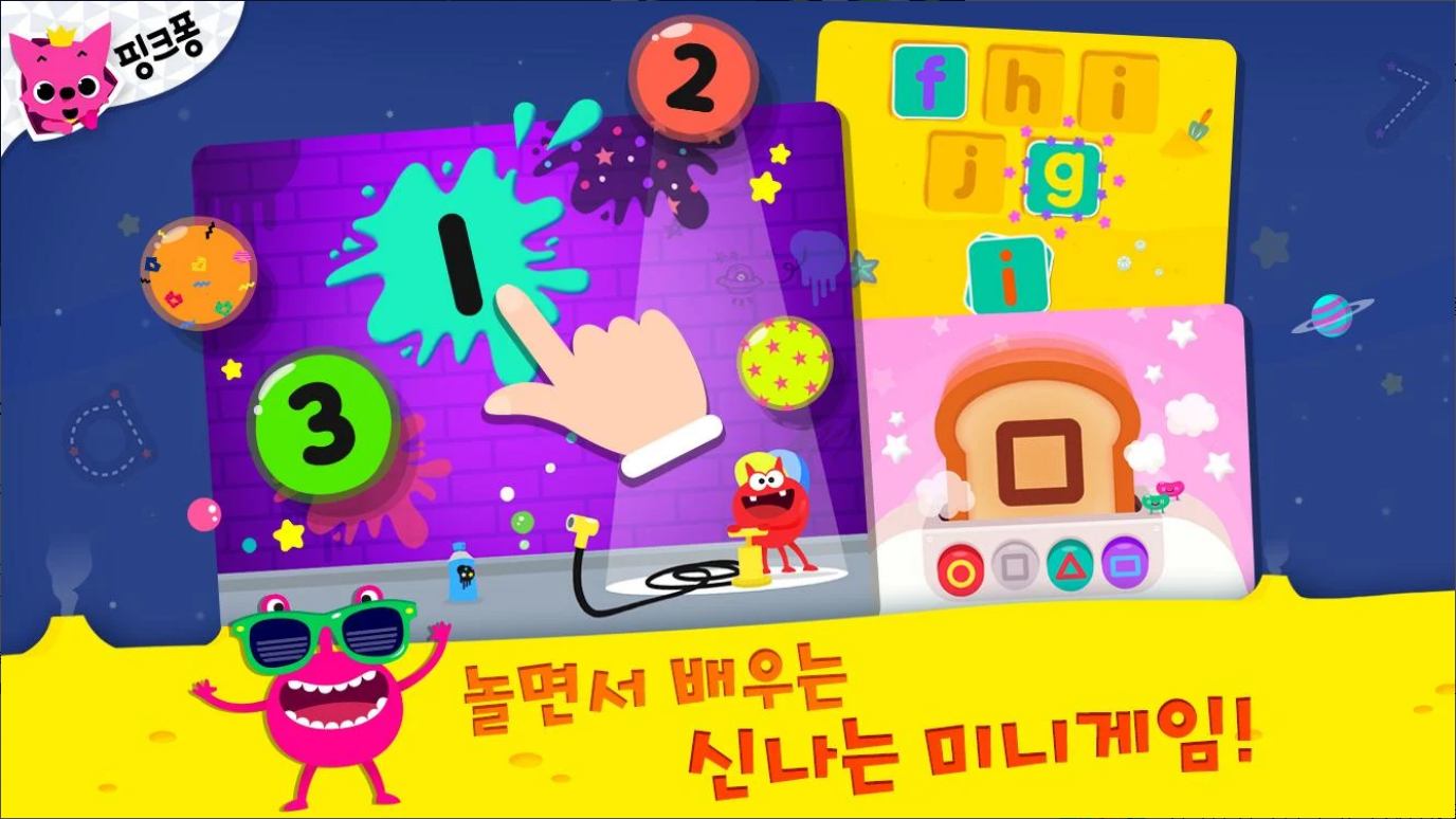 또, 핑크퐁 따라쓰기에는 미니게임으로 놀면서 배우기 기능을 갖추고 있어 알록달록 ABC 로켓을 발사하며 알파벳을 복습하고, 버블 게임과 카드게임으로 숫자와 모양을 인지합니다.
