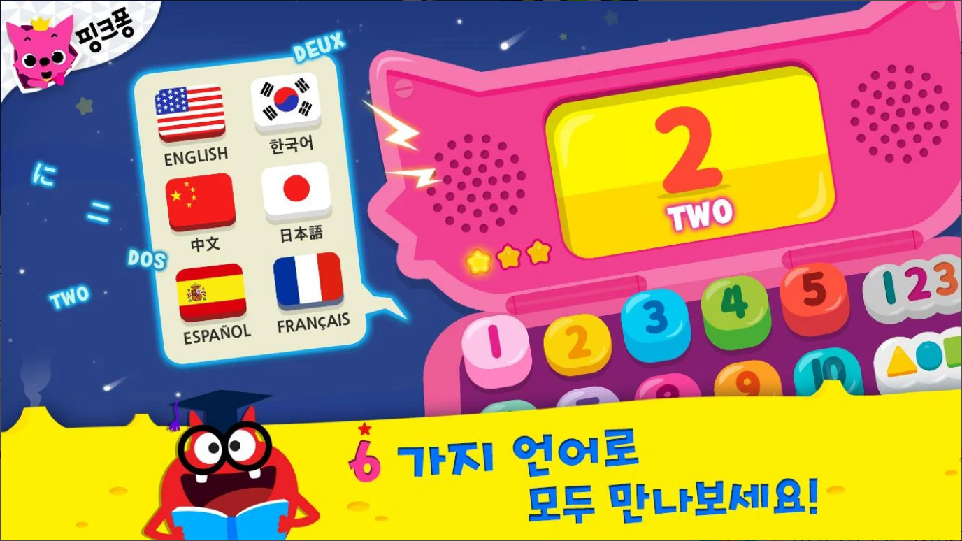 핑크퐁 따라쓰기와 함께 알파벳 대문자, 소문자, 숫자, 모양을 6가지 언어로 모두 배우세요!