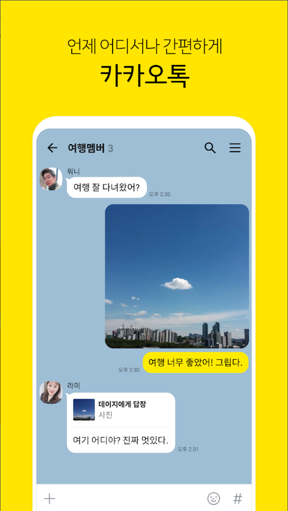오픈 채팅이나 카카오 뷰같은 다양하고 편리한 서비스들이 지속적으로 업데이트 되고 있어, 앞으로도 기대가 되고 있으며, 가입과 로그인 없이 전화번호만 있으면 실시간 그룹채팅 및 1:1 채팅을 즐길 수 있고, 사진, 동영상, 연락처 등의 멀티미디어도 간편하게 주고 받을 수 있습니다.