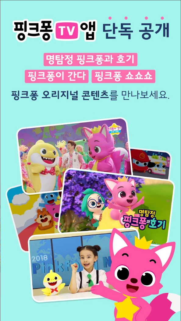 - 핑크퐁TV는 안드로이드 폰과 태블릿, 안드로이드 TV 모두에 최적화되어 있습니다.